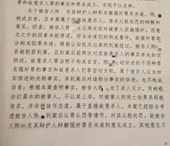 该案于1月15日作出一审判决。潇湘晨报记者掌握的判决书显示,河南驻马店市检察院指控,2024年7月25日22时许,嫌疑人陈某驾驶电动三轮车遇到19岁女生小雨(化名)独自一人在路边看手机,陈某上前搭讪以带其兜风为由将其诱骗上车,相继带至附近一小树林及一水塘边小路,两次欲对小雨实施强奸。趁陈某在水塘边的小路停车之际,小雨下车向水塘边跑去, 陈某追至水塘边用手去抓,小雨为躲避掉入塘内。随后陈某折断水塘边一棵小树,用树棍多次敲打小雨身体不让其上岸,致使其溺水身亡。