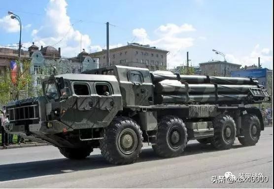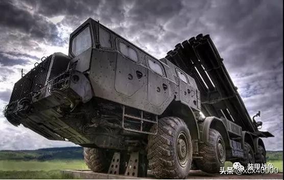 BM-30龙卷风火箭炮 1977年装备苏联陆军。16个发射管,分三层排列,上层为4管,下面两层各6管。配用弹种有榴弹、化学弹和子母弹,一次齐射可布设368枚反坦克地雷。