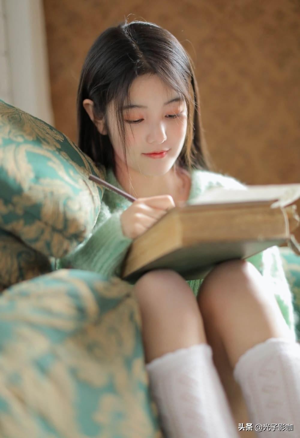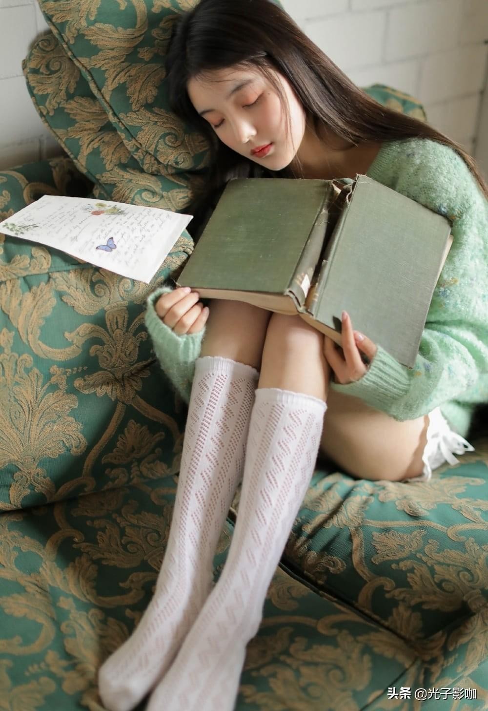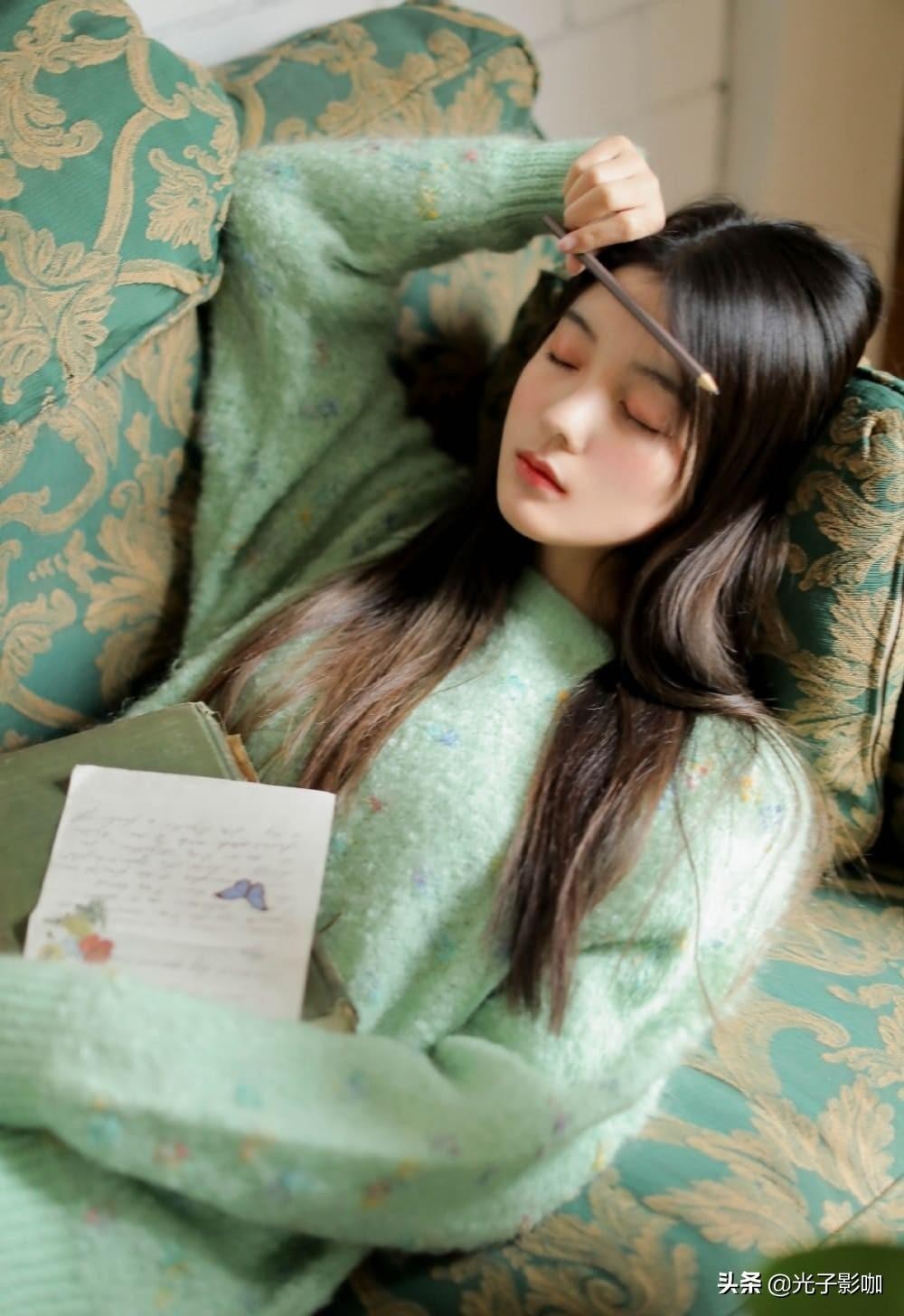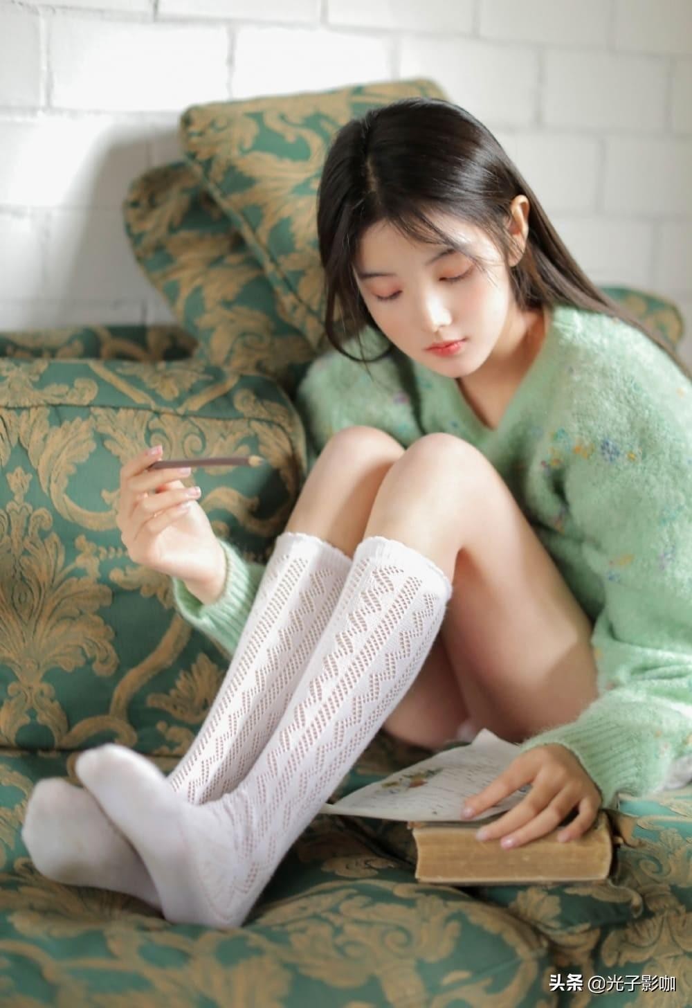 少女静静的躺在沙发上熟睡,白嫩的肌肤像牛奶一样光滑透澈,谁不想拥有如此透亮的皮肤呢?绿色毛衣的搭配让少女整个人看起来格外的青春活力,仿佛从校园中走出来的女神一样,白色的镂空丝袜更加彰显出美女的可爱风。