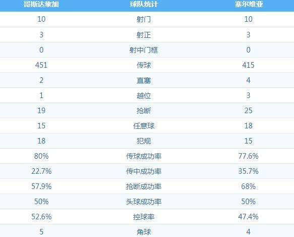 哥斯达黎加VS塞尔维亚全场数据:射门、射正数均相同