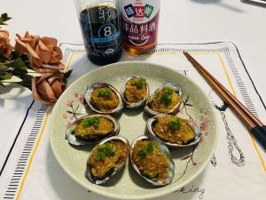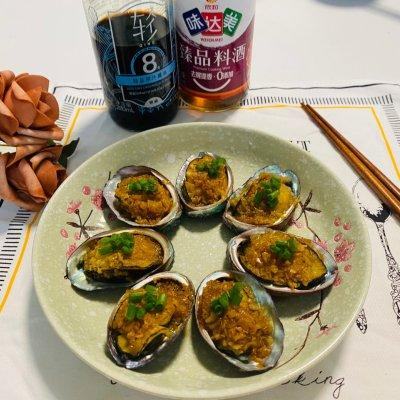 用料鲜鲍鱼 7-8只蒜 5瓣六月鲜轻盐酱油 1茶匙葱白 适量葱绿 一小把盐 1勺姜 2片味达美臻品料酒 1勺鸡精 1勺白砂糖 1勺