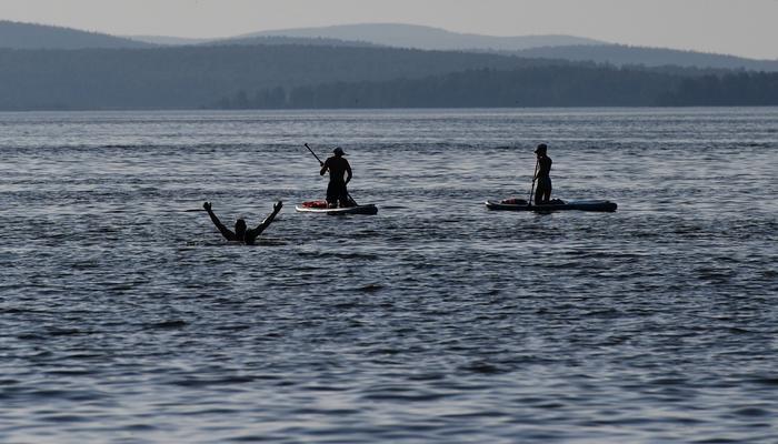 7月25日,人们在俄罗斯叶卡捷琳堡的一个湖中划桨板。新华社/卫星社