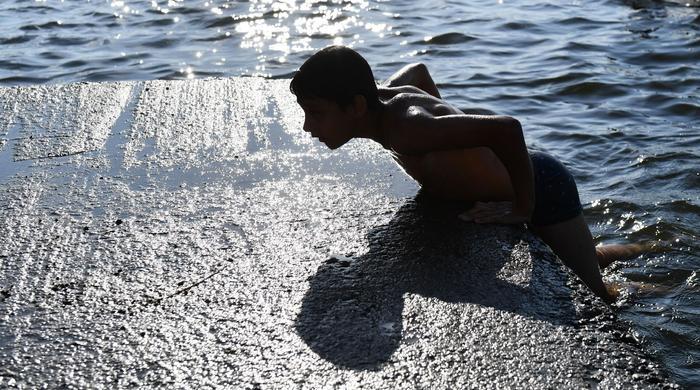 7月25日,在俄罗斯叶卡捷琳堡,一名男孩从湖中爬上岸边。新华社/卫星社