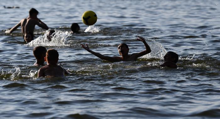 7月25日,人们在俄罗斯叶卡捷琳堡的一个湖中玩球。新华社/卫星社