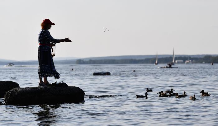 7月25日,一名女子在俄罗斯叶卡捷琳堡的一个湖边喂鸭子。新华社/卫星社