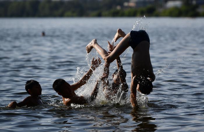 7月25日,孩子在俄罗斯叶卡捷琳堡的一个湖中玩水。新华社/卫星社