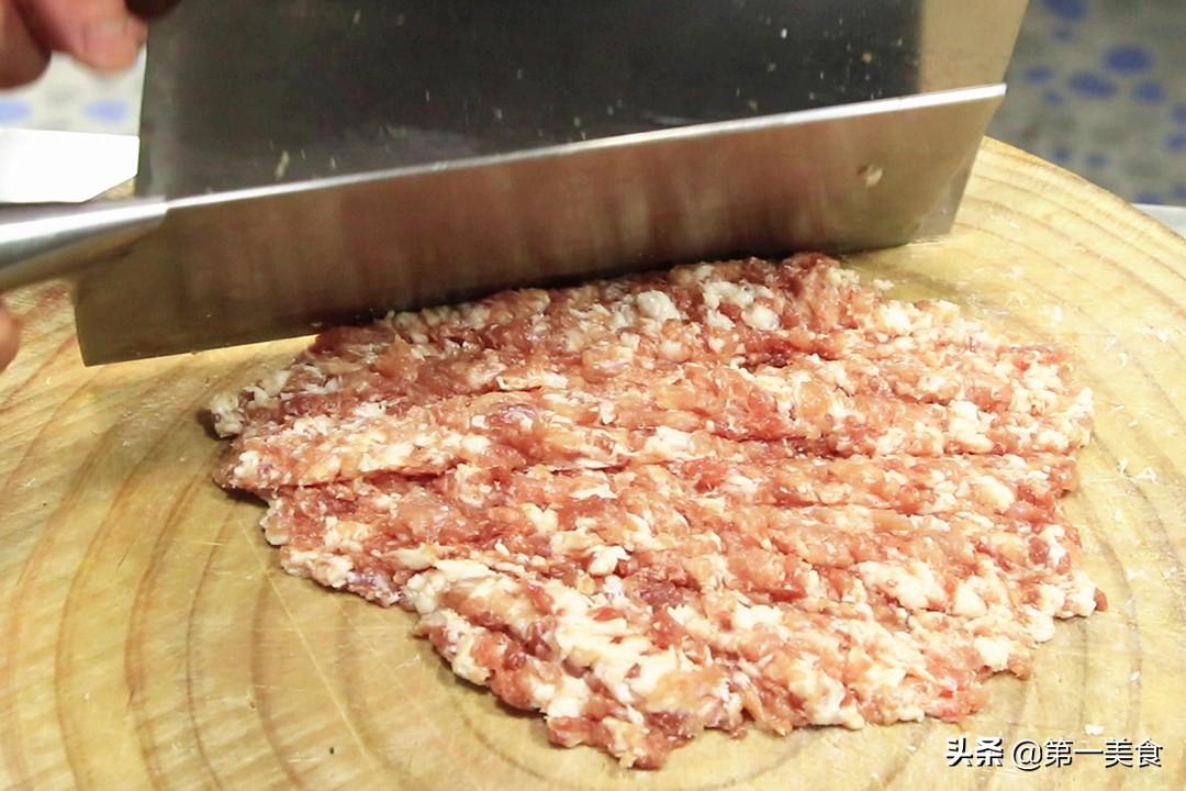 1.首先,我们准备一块五花肉,先切成肉片,再剁成碎末,这里强烈建议手工剁馅儿,机器绞出来的馅,肉与肉之间没有筋性、口感不够好,另外肉馅不要剁得太碎,要有点颗粒感,才有嚼劲。