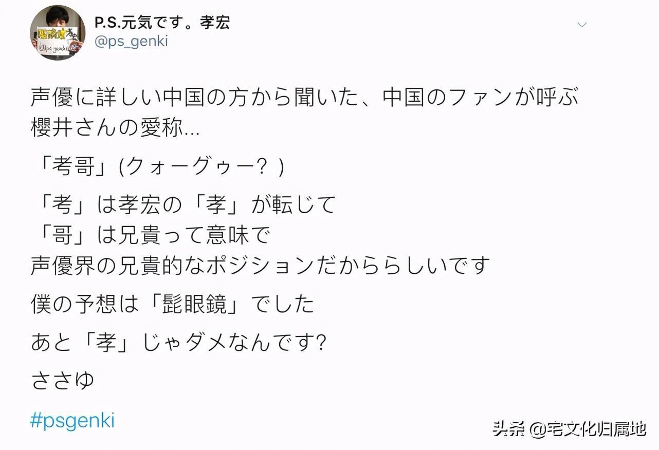 【PS元气孝宏】的官推曾转发过樱井孝宏的留言。从一位“很了解声优的中国人”那里听说了一件事,中国粉丝对樱井先生的爱称是“考哥”(扣锅?)。“考”是从樱井孝宏的孝字转换过来的,“哥”代表其在声优界大哥的一种位置。我的预想应该是“胡子眼镜”才对啊,还有就是用“孝”这个字不行吗?