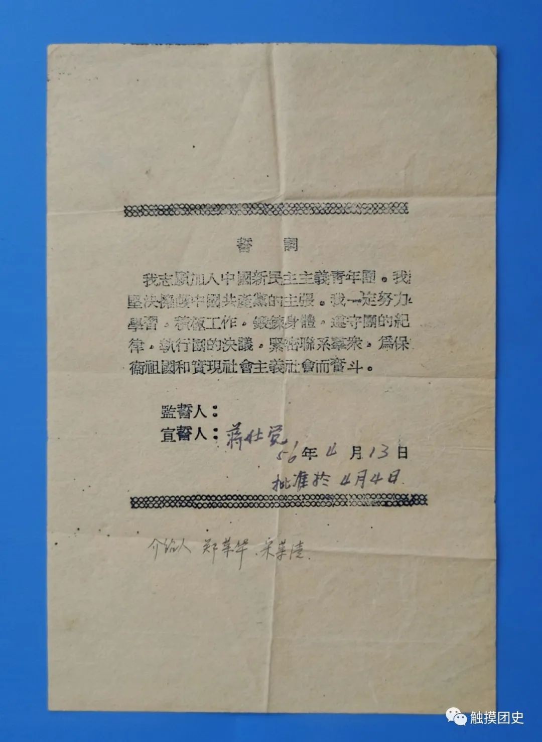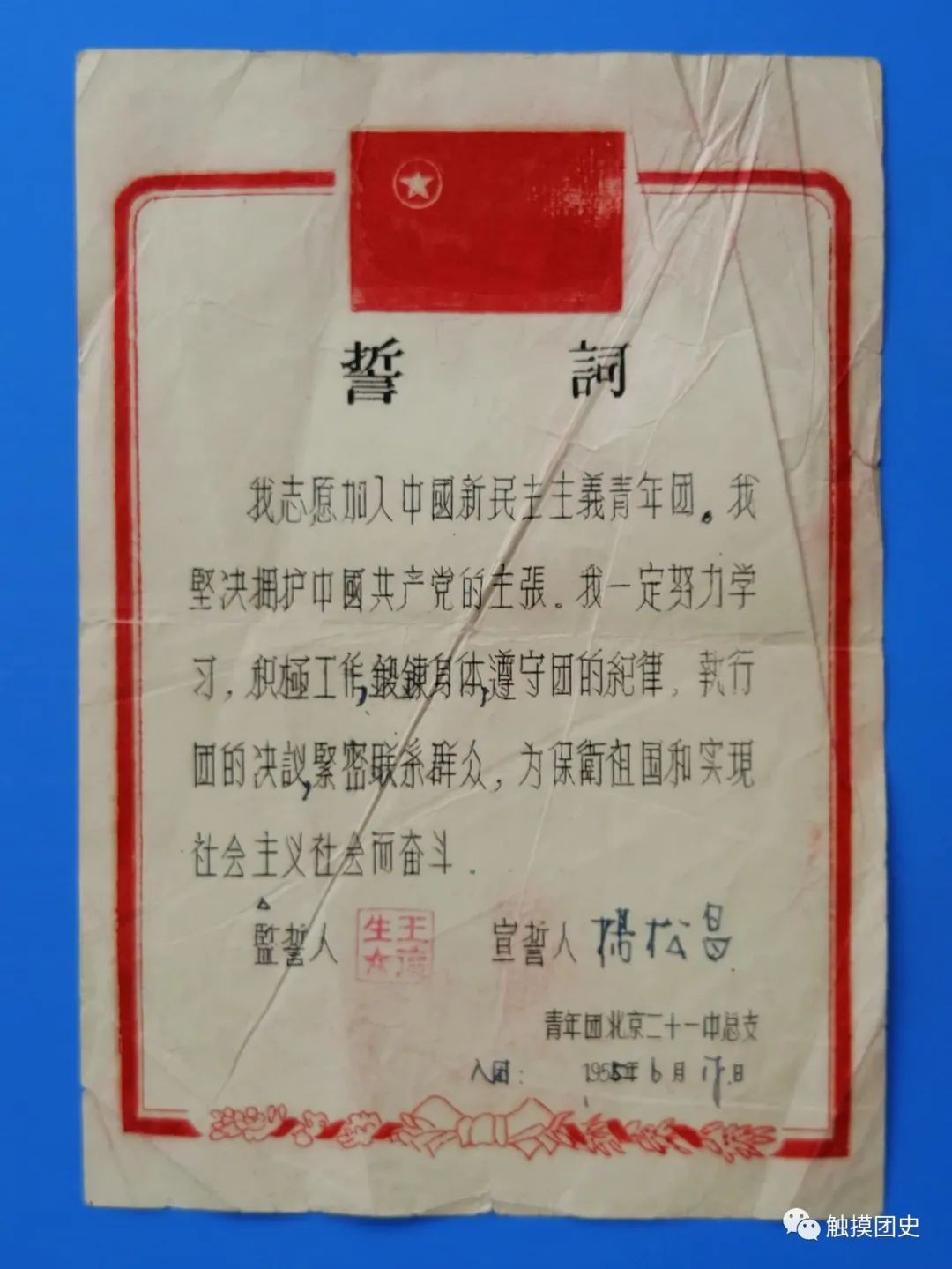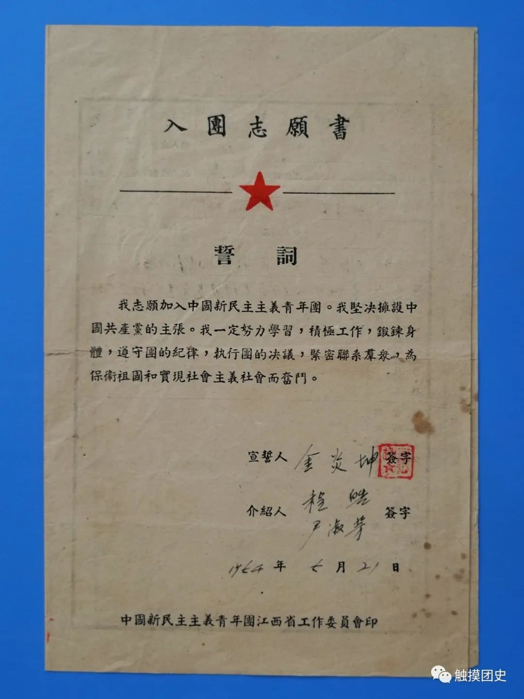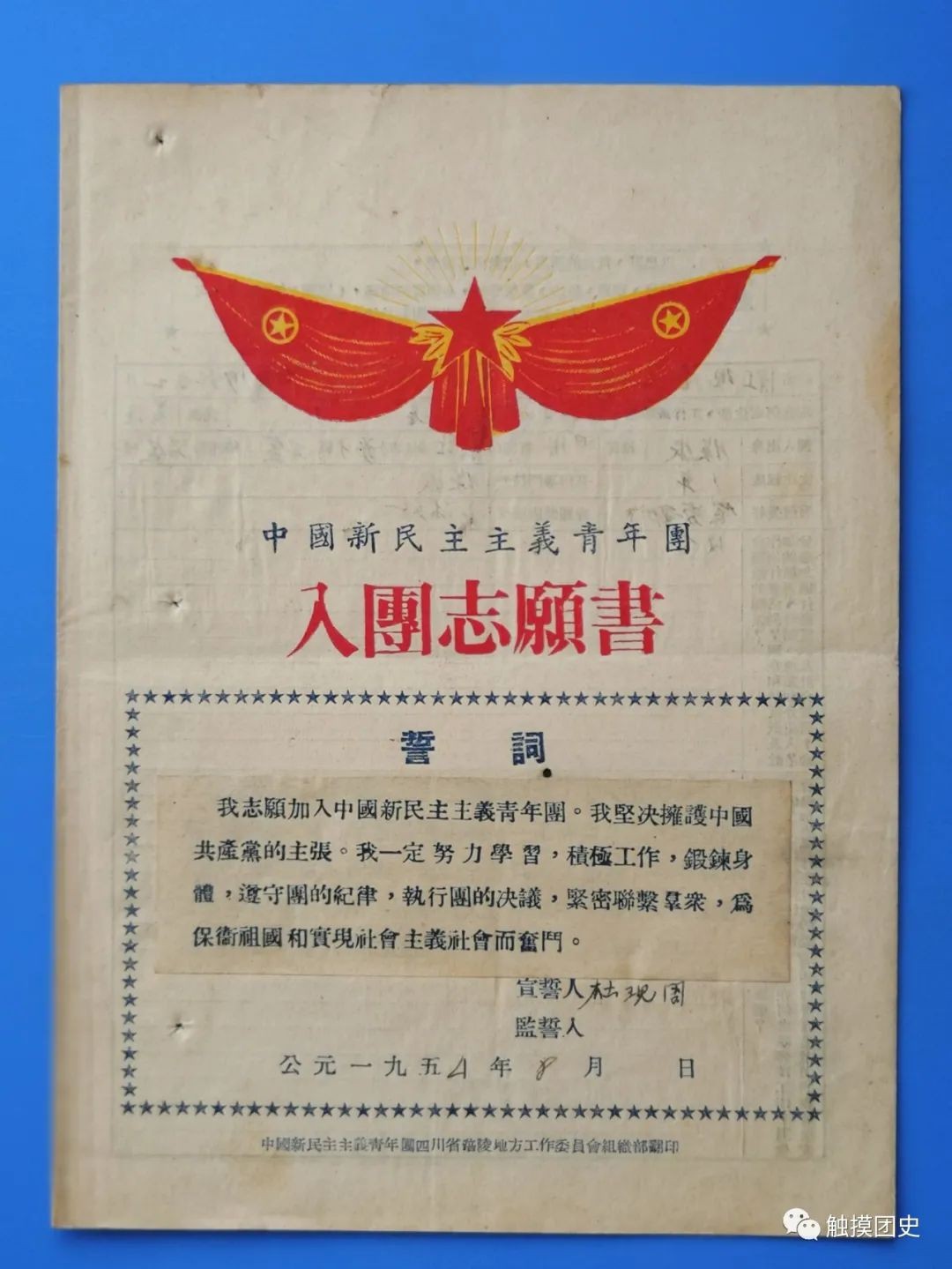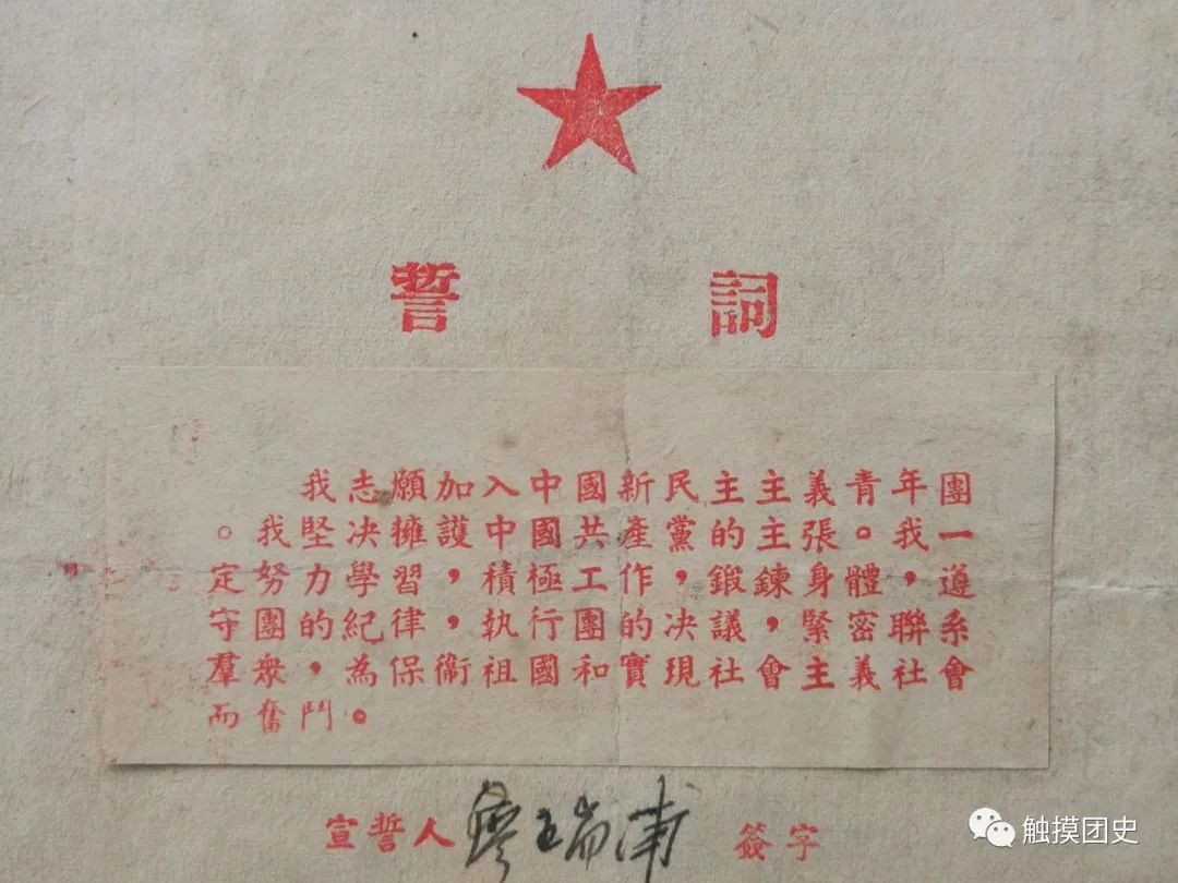 与首版《入团誓词》翻印情况对比,第二版标点符号不一致问题,已基本杜绝,仅仅是这份带团旗的油印《入团誓词》,刻写蜡版时,有4处漏写和错写。 为便于大家对照学习了解,我们将首版《入团誓词》原文附于下面: 我志愿加入中国新民主主义青年团,坚决拥护中国共产党的主张,努力学习马列主义——毛泽东思想,遵守团的纪律,执行团的决议,全心全意为人民服务,在各种革命工作中起模范作用,团结广大青年群众,为新民主主义中国的建设,全人类的彻底解放,奋斗到底。谨此宣誓。