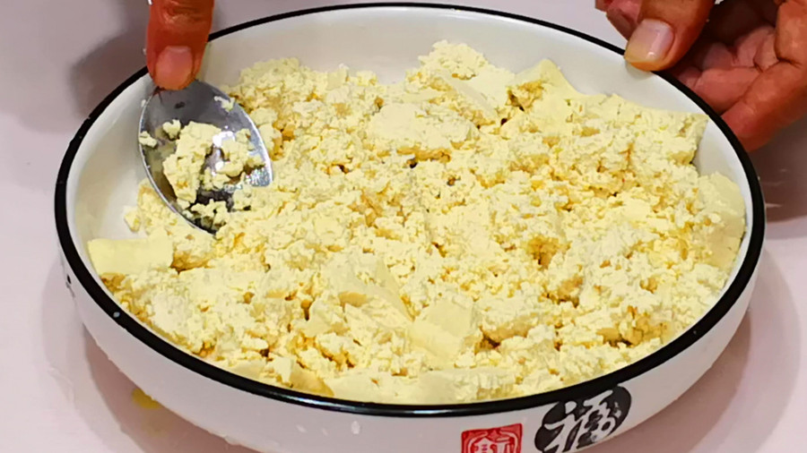 一块老豆腐放入大碗中,加入没过豆腐的开水烫一烫,这样可以去除豆腐的豆腥味,吃起来口味更纯正,然后再放到大碗中用勺子碾碎,或者放到菜板上用刀压成豆腐渣。