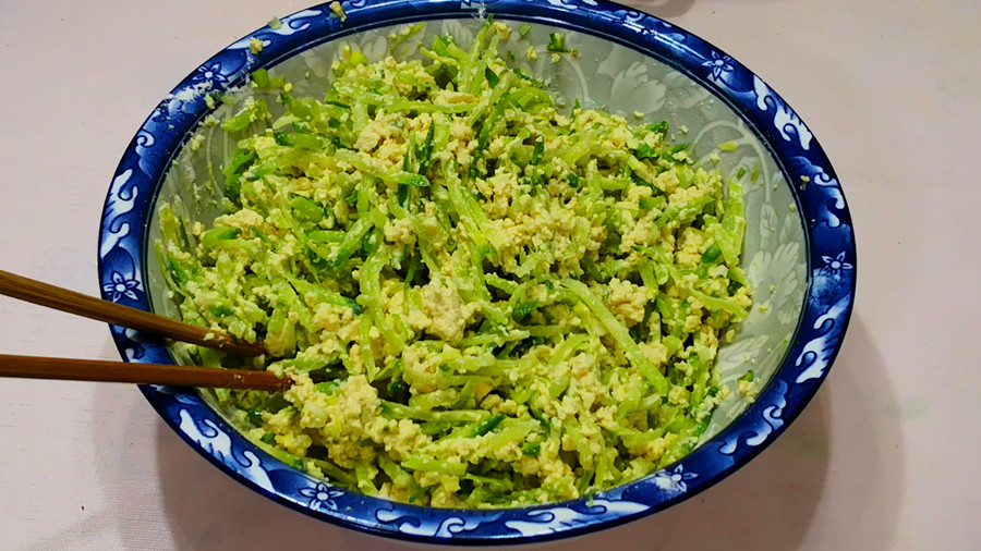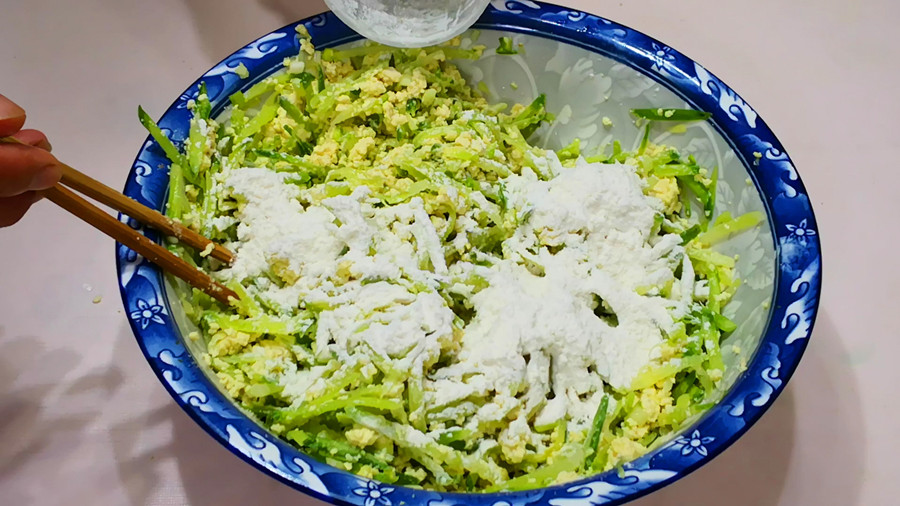 2、然后再把豆腐渣和萝卜丝放到一起,再开始调味:先加入1勺盐、适量的花椒粉、两个鸡蛋,充分搅匀后再加入适量的面粉,分少量多次加入,一边倒一边搅拌,搅拌至馅料用手抓起后能捏成团即可。