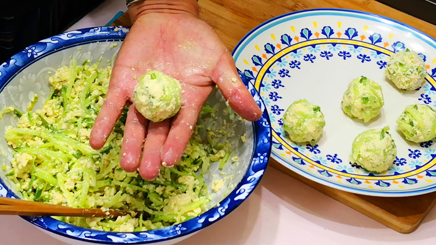 做这一步时,加入面粉只是起到粘连的作用,加至能让馅料成型即可,不要加太多了,否则做出来的丸子口感会发硬;