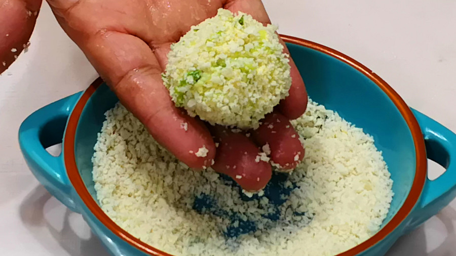 萝卜丸子团好以后,不要直接下锅炸,还要再多加一步,那就是准备一盘面包糠,将每个团好的萝卜丸子都放进去滚上一层面包糠。炸萝卜丸子时,外面裹上一层面包糠,不用复炸,做出的丸子也会又酥又脆。丸子的大小根据自己的喜好,不过小一点会更容易熟。