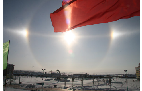 所以只有同时具备了风雪、薄云、和零下三十度以下气温的条件,才能出现这种阳光折射的大气层现象。