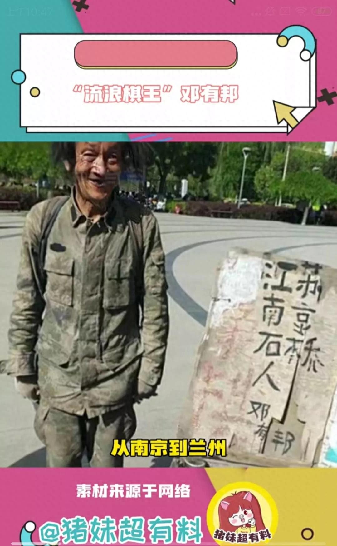 网友们之所以对邓友邦肃然起敬,可能是因为经过生活的磨砺,绝大多数人都会放弃自己小时候的梦想,可唯独邓友邦这位衣衫褴褛的老人,穷尽了一生的精力去坚持那个最初的理想,成为了网友心中的流浪棋王
