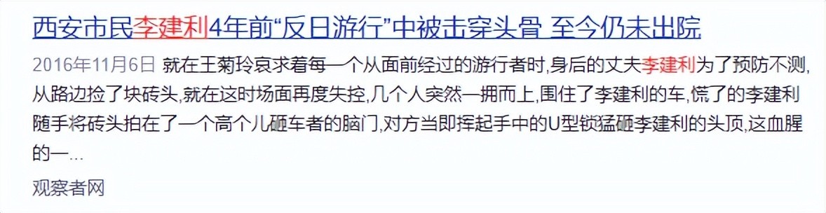 资料参考:2016-11-06观察者网——西安市民李建利4年前“反日游行”中被击穿头骨 至今仍未出院