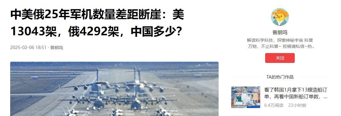 中美俄25年军机数量差距断崖:美13043架,俄4292架,中国多少?