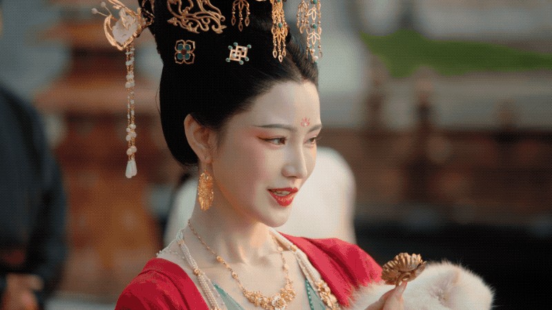 在角色的妆造上,除了有常见的红色花钿外,女主角额头上的花钿也采用了在唐时期常见的绿色“翠钿”,而且出场的每位角色发型、簪钗、步摇、耳环等都各有特色,这些视觉部分的元素除了考究和质量上乘外,这种没有“工业化”批量生产的个体差异,也更符合故事和时代背景,毕竟在高压的“宫廷生存”环境下,谁都不愿意“和别人一样”。