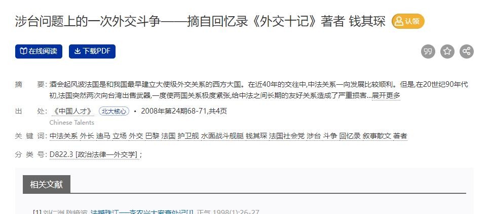 参考资料:[1]涉台问题上的一次外交斗争——摘自回忆录《外交十记》著者 钱其琛[J].中国人才,2008(24):68-71
