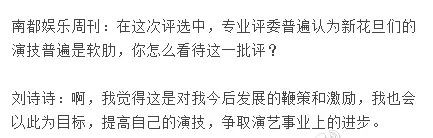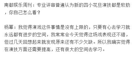 “四小花旦”都存在软肋,那就是演技,刘诗诗杨幂都回应了质疑,对于她们来说表演是永恒的功课,演技至今仍需要磨练。