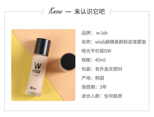 第二个是粉底液的质地和成分,这款超模粉底液的质地是比较细腻的,看上去是滋润的,是比较水的那种。涂抹的时候延展性不错,很容易涂匀,涂抹后不是很白的那种颜色,还真有点超模的妆容的质感。不过这样的粉底液给人的感觉并不轻薄,但对肤色的修正度还是不错的。wlab适合所有肤质,不用担心过敏等原因。