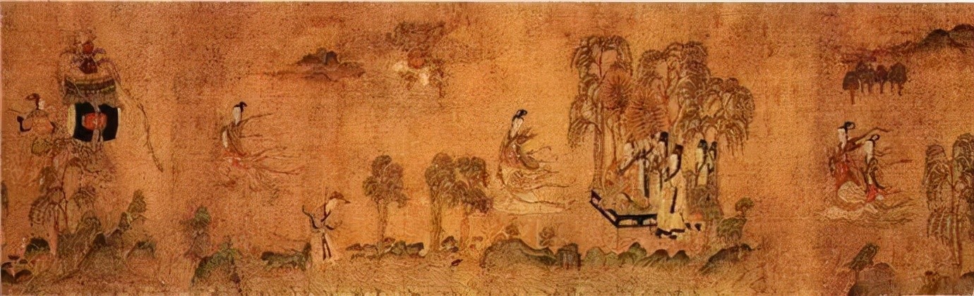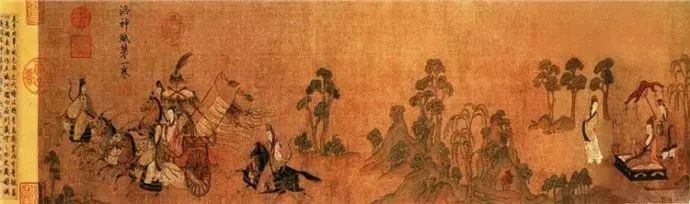 此画是以魏国杰出诗人曹植的《洛神赋》为蓝本创作的。《洛神赋》以浪漫主义手法,描写曹植与洛水女神之间的爱情故事。顾恺之的《洛神赋图》发挥了高度的艺术想象力,富有诗意地表达了原作的意境。画卷采用连环画的形式,随着环境的变化让曹植和洛神重复出现。画卷长27.1厘米,横572.8厘米,绢本设色。