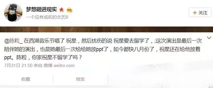 就这样,刚深爱一年的爱人出国留学了。而祝星的wb上,全是出国后对陈粒的思念。二人相识微时,却在盛世分道扬镳。