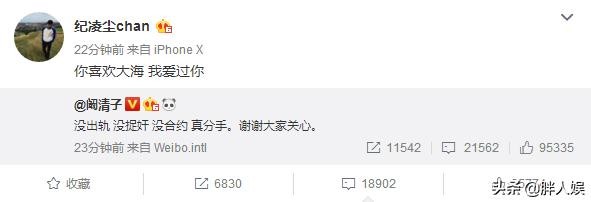 令人惊讶的并不仅仅在于此,而是纪凌尘的反应同样让吃糖吃得发腻的网友又吃了一惊,他转发了阚清子的微博,还配上了颇有深意,却让网友不知是什么梗的话:你喜欢大海,我爱过你。