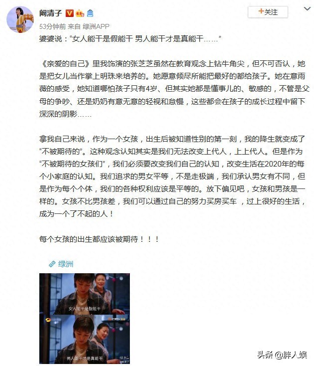 今天,阚清子关于男女平等的一段感言上了热搜。