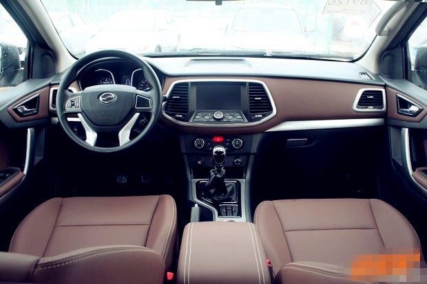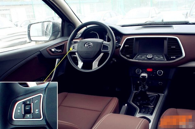 内饰采用棕色与黑色搭配,中控台和空调出风口均采用镀铬装饰条,整体效果很好很有质感。方向盘兼顾了多媒体和蓝牙控制按键,并配备有中控彩色大屏,完全让人感觉不到这是一台外形粗犷的大皮卡。