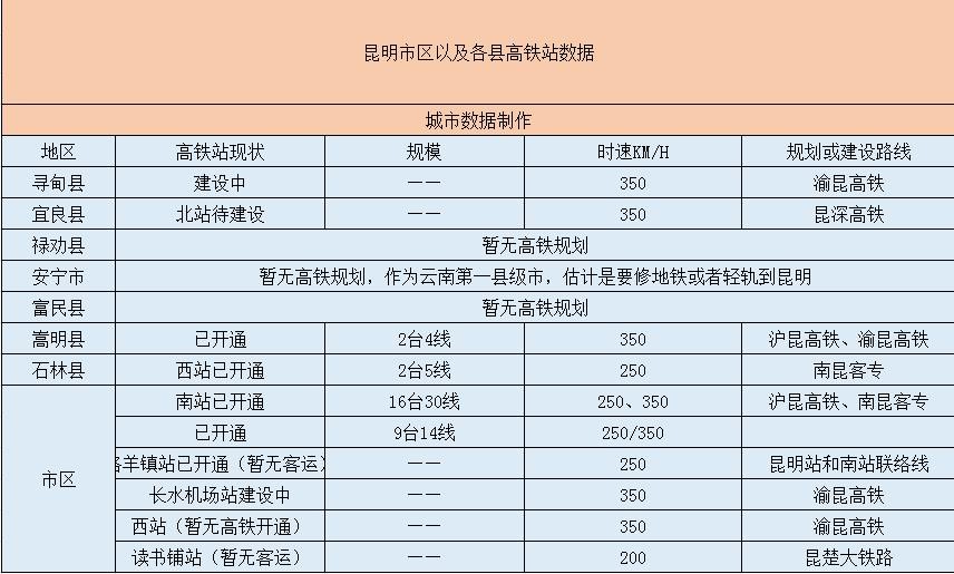 昆明市目前拥有4个高铁站在正常是使用中,其中有2个高铁站是位于城区,另外二个高铁站则是位于下辖的县级单位中,禄劝县和安宁市以及富民县三个县级单位暂无高铁规划。