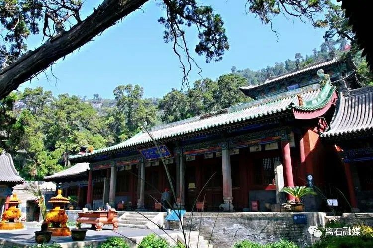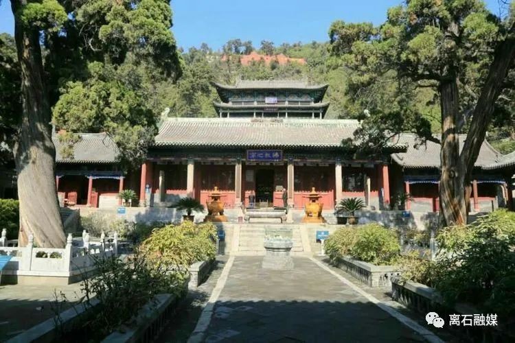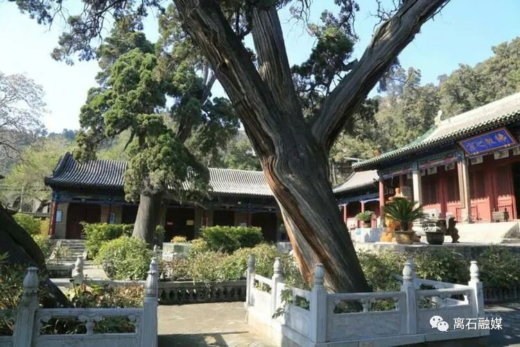 穿过“龙云虎风”洞,就到达了中院,最先映入眼帘的是“八卦石”,有玻璃罩保护,正面镌刻的周文王后天“八卦图”,古朴典雅,周边镌刻着“暗八仙图”,惟妙惟肖。正面高大月台之上建有全寺中心建筑“大雄宝殿”,原建于唐,重修于宋,在明宣德年间、明正德年间、清代嘉庆九年(1804年)三次重建,面阔五间,九檩八椽悬山顶,绿琉璃瓦剪边。殿内三尊大佛,通身金妆,肃穆庄严,是释迦牟尼的三身佛像,为明永乐五年(1407年)塑造。殿前八角石檐柱,重逾数吨,通体笔直,粗犷雄伟,坐落于雕刻精美的石制青狮、银象,朝天犼之上,蔚为壮观。大殿有一副楹联:卦演连山,分二挂三,翠柏丛林含万象;爻重大壮,上栋下宇,梵王古殿历千秋。系清代举人武来雨原句,当代著名书法王朝瑞重书。此联将山形卦象、寺院殿堂及翠柏丛林浓缩于联语中,描述了卦山的风光景致与文化内涵。东西两厢各有配殿一座,东偏殿里塑有关老爷秉烛夜读春秋,庄严肃穆。绕着殿前之路转到大殿背后,有一小石碑甚是奇特,正面和侧面看的效果截然不同,碑上是著名的江南才子朱彝尊撰写的《卦山题名》文题壁。