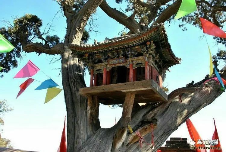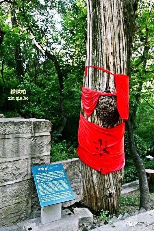 绣球柏:树主干7米处分3枝呈伞状直上,主干距地面2.1米处生绣球花似菌球,树冠下有绣球怒放,绣球上有伞形树冠,人称"绣球柏"。