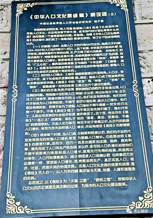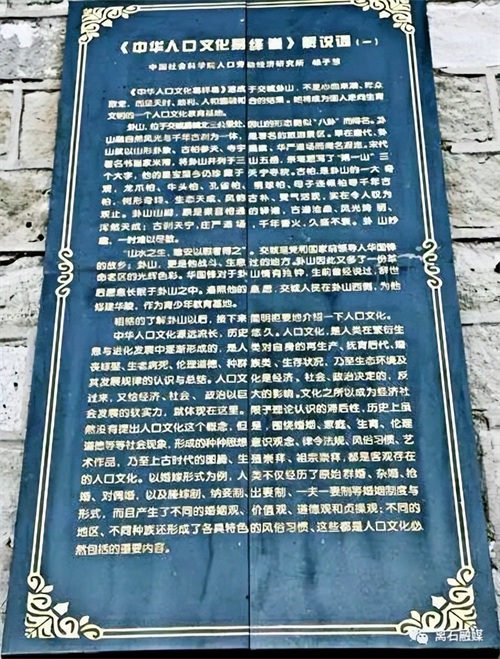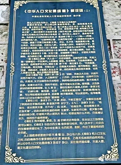 继续上行,在沿途靠山道左侧有《中华人口文化易绎卷》长廊,这是人类走向生育文明的教育基地。中华人口文化源远流长,历史悠久。人口文化是人类在繁衍生息与进化发展中逐渐形成的。漫步于百米长廊之间,品读卦山与八卦、《易经》和人口文化之内在联系,领悟天成地就的自然和合。令人惊奇的是:一部《易经》贯穿“天人合一”的哲学思想,内容包罗万象,天地人物一切事物无不在其中。由此可见,《中华人口文化易绎卷》落于卦山既顺理成章,又实现了文化建设的创新。
