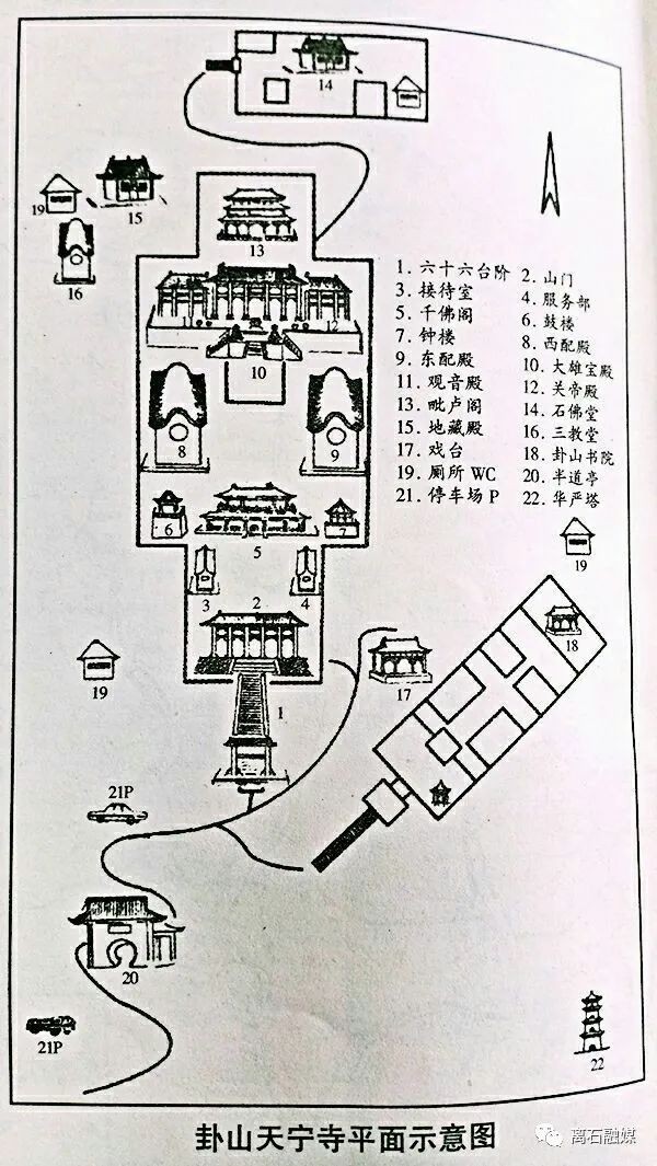 天宁寺,地处卦山怀抱中,坐北向南,依山而建,三进院落梯次升高。从中轴线上看,天宁寺建筑依次为石牌楼、六十六级台阶、山门殿、千佛阁、大雄宝殿、毗卢阁。