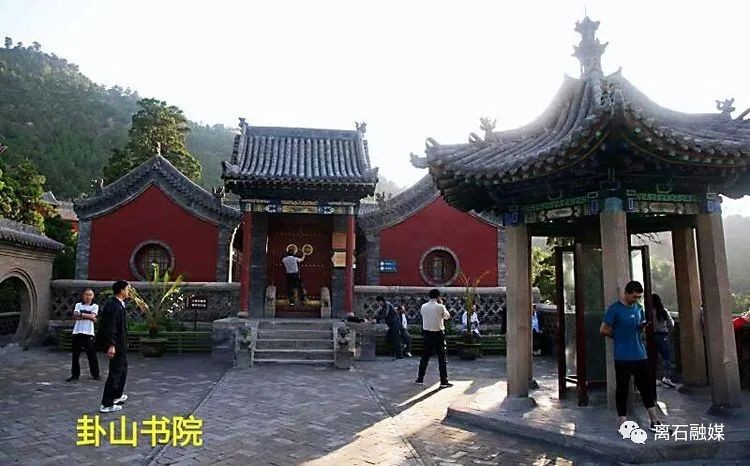 沿着108级台阶攀援而上,就是“卦山书院”,位于天宁寺前卧龙岗上,始建于明代,四周翠柏环绕,十分幽静,是读书学习的理想环境。院落略向西南,院分三进。院前有二柱一楼式木构牌楼,建于清嘉庆十八年(1813年),巍然屹立,气势宏伟,门额上书“卦山书院”四个金色大字,字迹端庄,系嘉庆年间交城知县王鸿文手迹。卦山著名的“回音皆”就建在书院牌楼之前,计13步。当游人拾阶上下,则步履铿锵作响,宛如金玉之声。前院作庭园格局,三面花栏短墙,左右月门;中院门楼门额题字“浮岚”,系清代文人李配兰手迹。“岚”指山林中悬浮的雾气,一般在夏秋季节的清晨可以看到,是为写景词语。中院两侧为斋舍,是学员自学场所,也是食宿用房。讲坛是整个书院的中心建筑,面阔五间,处在前后院之间。清康熙初期,朱彝尊、傅山、顾、炎武、番耒、阎尔梅、王士禄等游历卦山并受聘”课艺诸生。清康熙四十五年(1706)重建,中心建讲堂悬”圣习时中”横匾,系清道光皇帝手笔。清咸丰七年(1857年),梁述孔担任卦山书院院长。其间,我国近代著名地理学家、鸦片战争中爱国主义者徐继畲来游卦山,造访乡亲梁述孔,宿卦山书院。