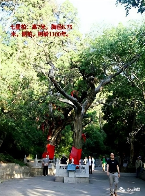 七星柏:主杆分5枝,好似举手迎客,因主干上有7个孔洞,所以称"七星柏"。