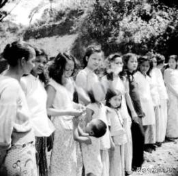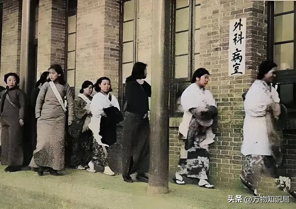 在照片中,一群慰安妇正在医院门口排队检查身体,在这些人中,有穿着和服的日本女子,也有自愿充当慰安妇的汉奸。大部分女性的表情都显得十分麻木且苍白,而其中几个女汉奸却显得十分得意,暴露了她们内心的丑恶和冷漠。