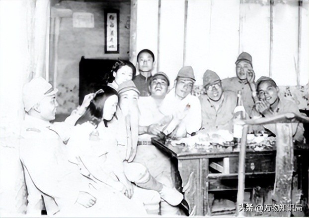 在这张照片中,一个慰安所里,一群日军围着两名中国慰安妇狂欢着,尽情享受着他们的花天酒地,整个慰安所显得昏暗而肮脏,暴露出这个地方的肮脏与卑劣。