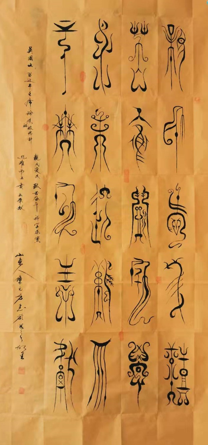 陈元方,字伯举,号山东人,三石斋居士、蒙山居士、琅琊居士、琅琊墨痴、涂鸦轩主。一九五四年生于临沂,大专学历,九三学社社员,临沂市政协十二届委员,政协十三届常委,九三学社临沂市委副主委。幼受庭训师伯父--著名书法家陈允升先生习字,遍临古今碑帖六十余载。在篆、隶、真、行、草、魏碑的基础上,继承传统勇于创新,再用笔、用水、用墨、上形成了独特的自我面目,独创了七彩塔体风格。