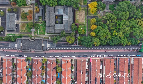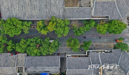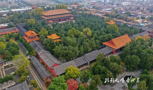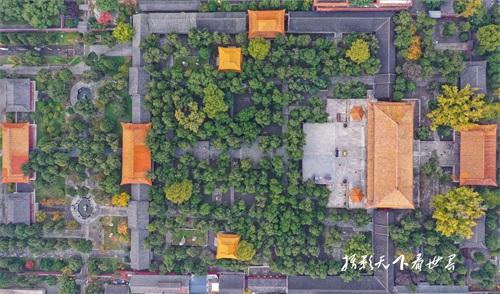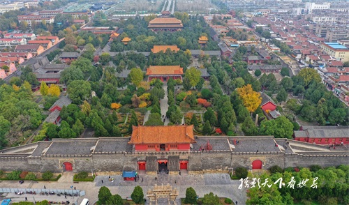 岱庙的古建筑群和周边居民区和谐相融,空中俯瞰景色迷人。