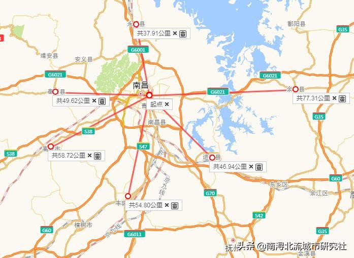 第四,余干是南昌周围距离南昌最远的县市,在地图上测量一下南昌到奉新、靖安、高安、永修、丰城、余干、进贤的距离,余干县城直线距离南昌八一广场有77公里,是最远的一个,而且南昌和余干之间隔着大大小小的湖泊,同样的距离也是难发展的,良田也是最多的。