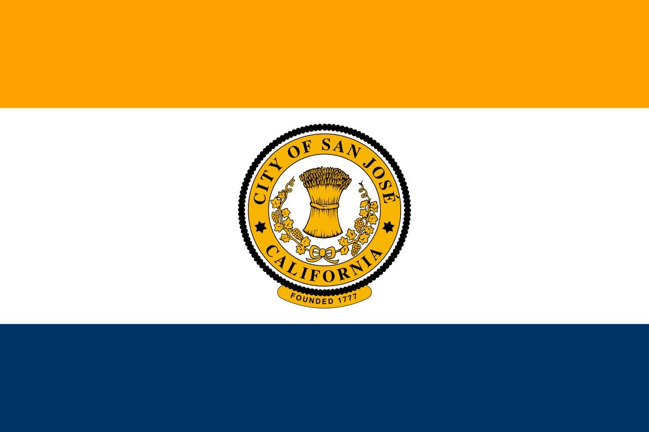 圣何塞的旗帜为金色、白色和蓝色的条纹,象征着加利福尼亚——金色和蓝色是加利福尼亚的官方颜色,中心则是城市的徽章。