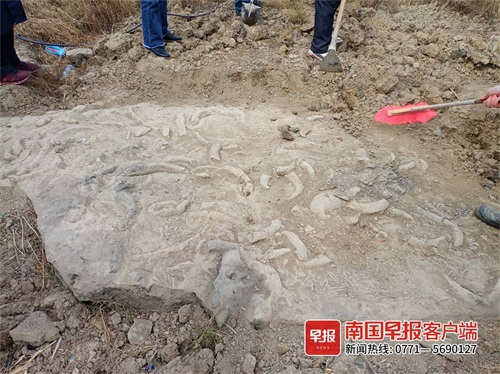 据环江吉祥村吉祥屯村民介绍,这块石群面积约有6平方米,系村民在山脚下干农活时无意中发现。春节期间,一些在外工作的年轻人回到家听闻后到现场查看,猜测这可能是化石。