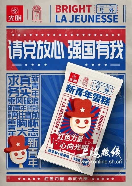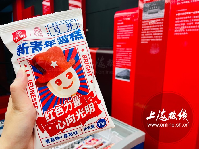 小编了解到,雪糕的原型自然是拥有数十年历史的光明娃娃雪糕,而将娃娃的咖啡色礼帽变成红色,则是对新青年精神的致敬。