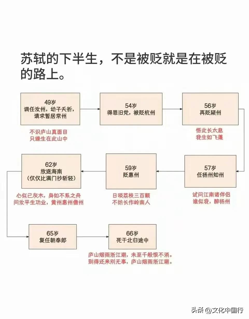 苏轼的一生犹如一部跌宕起伏的戏剧。他的一生可谓是大起大落,天才、黄州罪犯、副宰相、惠州罪犯、儋州罪犯。可是尽管苏轼的一生命途多舛,但是我们可以发现,苏轼仿佛是打不倒的不倒翁,不管在什么环境中,都积极创造美好的生活。