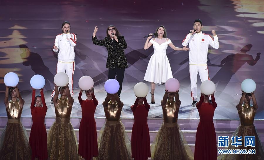 9月8日,游泳运动员傅园慧(左一)、徐嘉余(右一)和歌手郭峰(左二)、金池在闭幕式上演唱。 当日,第十三届全运会在天津闭幕。新华社记者岳月伟摄