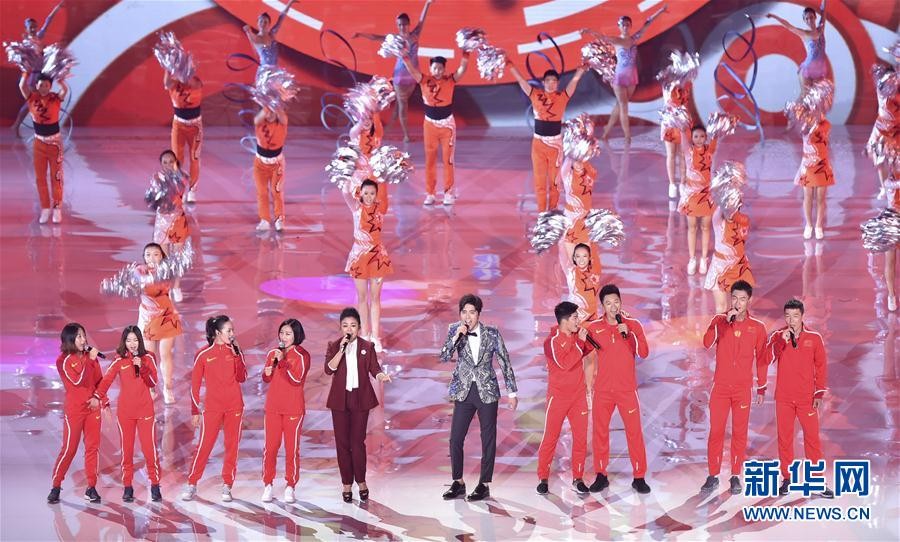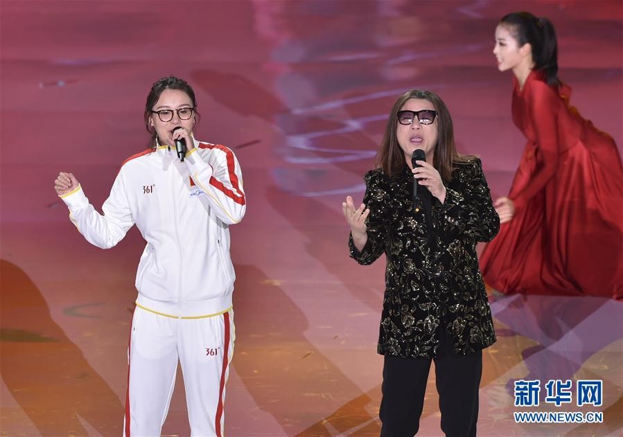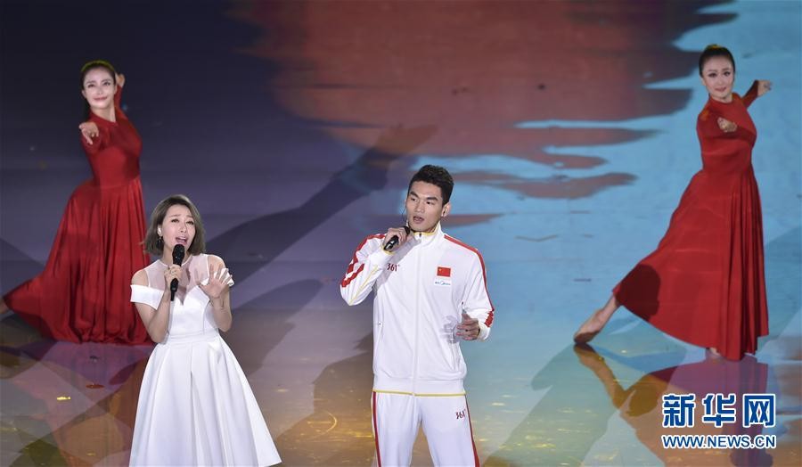 9月8日,游泳运动员傅园慧(左)和歌手郭峰在闭幕式上演唱。 当日,第十三届全运会在天津闭幕。 新华社记者岳月伟摄