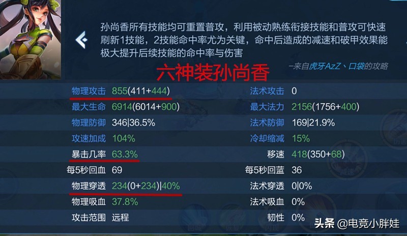 满级、满装备的孙尚香属性图,物理攻击855、暴击几率63.3%、物理穿透234(40%)。