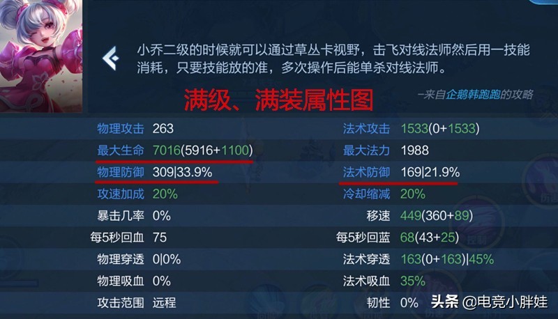 满级、满装备的小乔属性图,最大生命值7016、物理防御309、法术防御169。